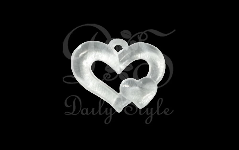 Hart amulet in het transparant wit. De amulet kan dienen als decoratie voor een bedankje, een hangertje voor aan een armbandje of kettinkje. Het hartje is 2,5×0,4x2cm (LxBxH) groot.