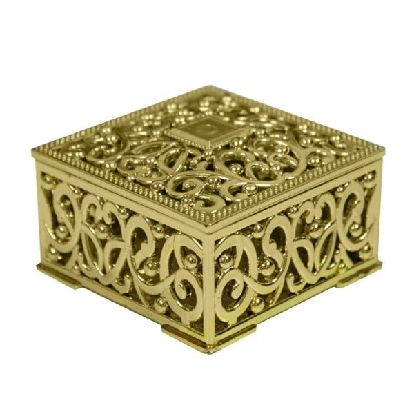 Barok doosje met deksel in het goud. Leuk om als bedankje weg te geven. De afmetingen van het doosje zijn 5,7×5,7×3,6cm (LxBxH). Een verpakking bevat 12 doosjes.