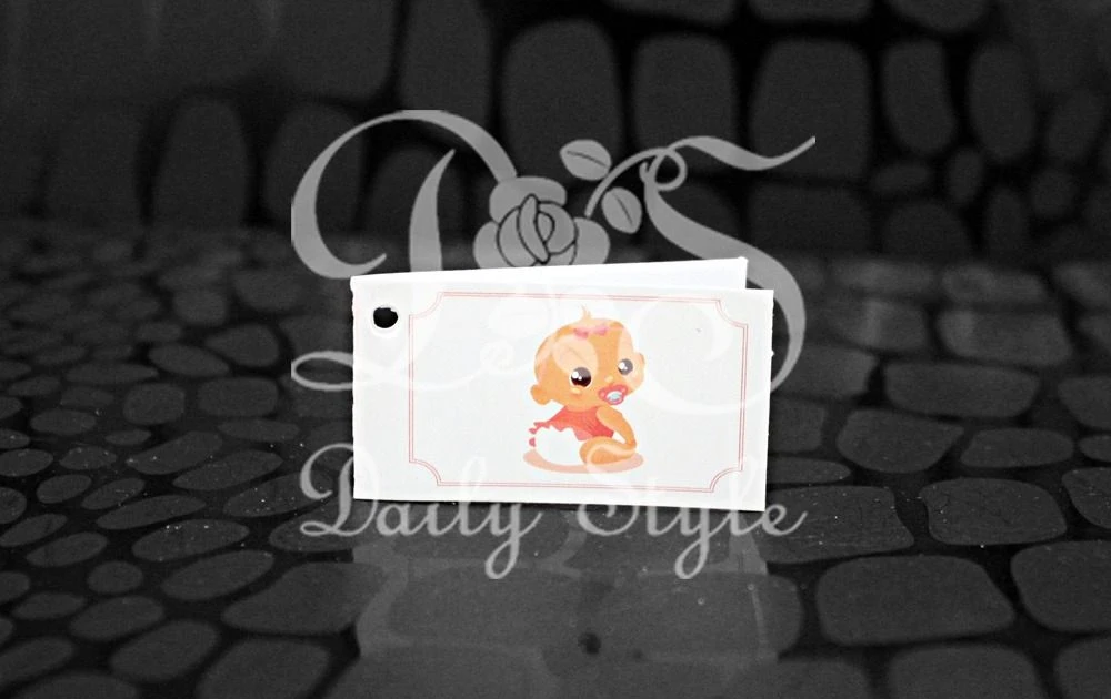 Bedankkaartje met een afbeelding van een poserende baby in het roze. Het kaartje is ingevouwen staat 4,5 x 2,5 cm groot. Eén verpakking bevat 24 kaartjes.