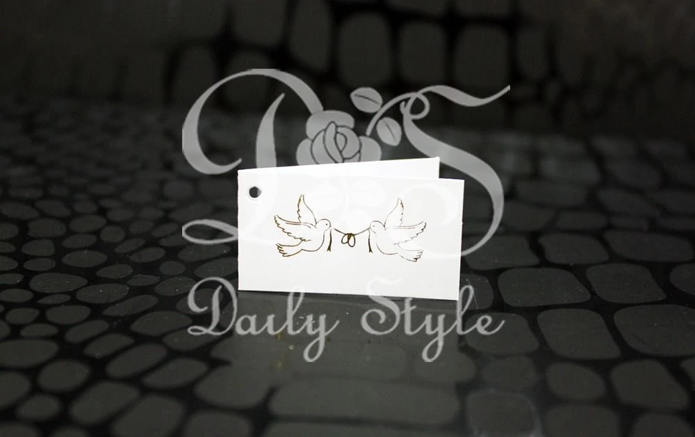 Bedankkaartje met tortelduifjes “tying the knot” in het goud. Het kaartje is ingevouwen staat 4,5 x 2,5 cm groot. Eén verpakking bevat 24 kaartjes.