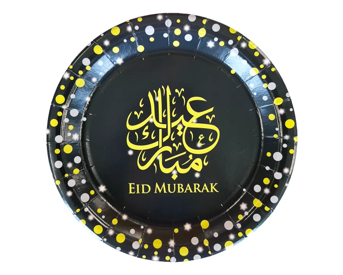 Stijlvolle Eid Mubarak bordjes gemaakt van papier. De bordjes hebben een doorsnede van 18cm en zijn verpakt per 8 stuks.