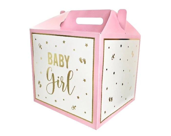 Kleine cadeaudoosjes met de tekst “Baby Girl” en kleine figuren bedrukt in goudfolie. Leuk om te vullen met cadeautjes voor de aanstaande mama en haar baby. De vouwdoos is 12x12cm groot en bevat een handvat van ca. 3cm hoog. De doosjes worden platgeleverd en zijn makkelijk in elkaar te zetten.