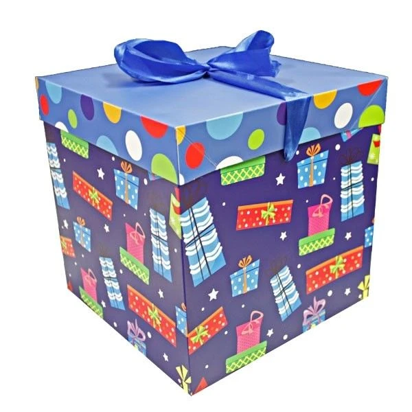 Kartonnen cadaudoos met deksel. De doos is bedrukt met cadeautjes en stippen. De doos wordt plat geleverd met een satijnen lint van 4 cm dik.Â