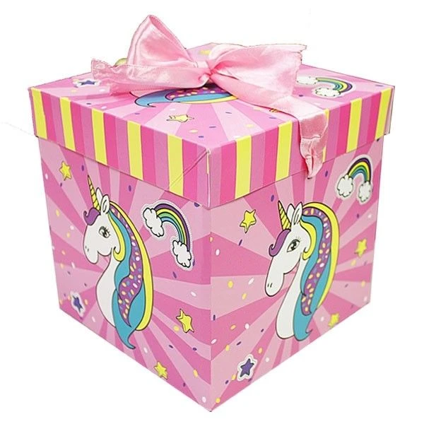 Kartonnen cadaudoos met deksel. De doos is bedrukt met eenhoorns, regenbogen, sterretjes en stippen. De doos wordt plat geleverd met een satijnen lint van 4 cm dik.Â