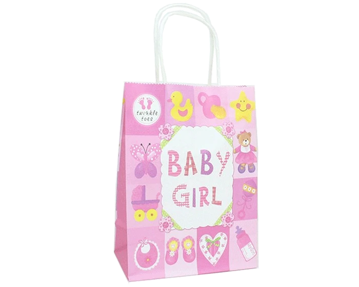 Schattige papieren cadeautasje met de tekst ‘BABY GIRL’ en verschillende baby gerelateerde afbeeldingen. De tasjes zijn 21 x 15 x 8 cm groot en verpakt per 6Â stuks.Â