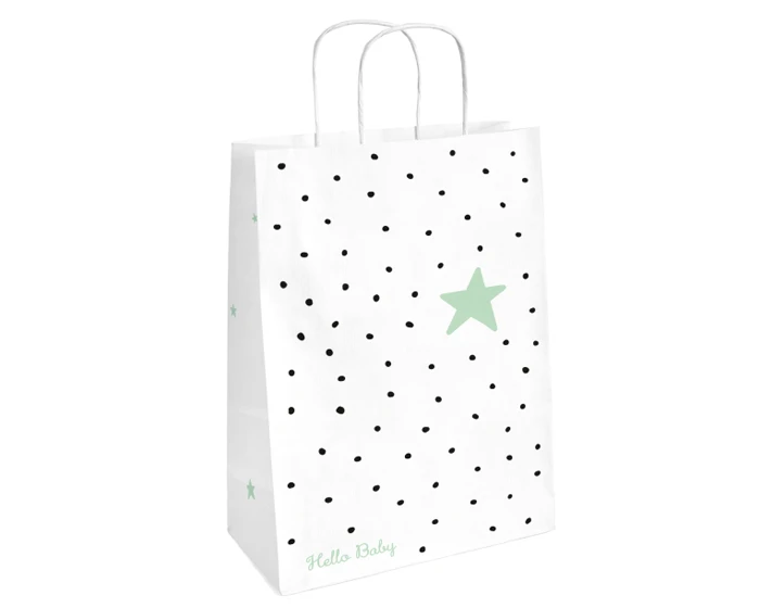 Schattige papieren cadeautasjes met zwarte stippen, een groene ster en de tekst ‘Hello Baby’. Perfect voor een babyshower of gender reveal. Elke verpakking bevat 8 tasjes met een afmeting van 23,4×16,2cm.