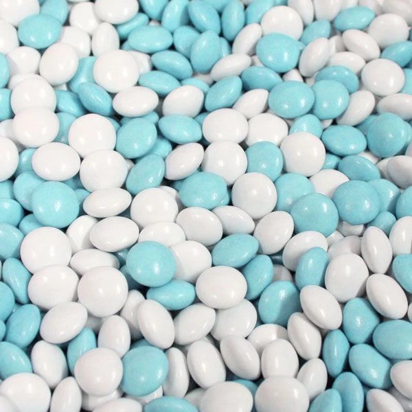 De mini chocolade dragees (Ø1cm) zijn verpakt per 900 gram en verkrijgbaar in de duo-kleuren roze/wit en blauw/wit. Niet alleen zijn deze zeer smakelijk, maar zijn ook mooi als favourvulling.