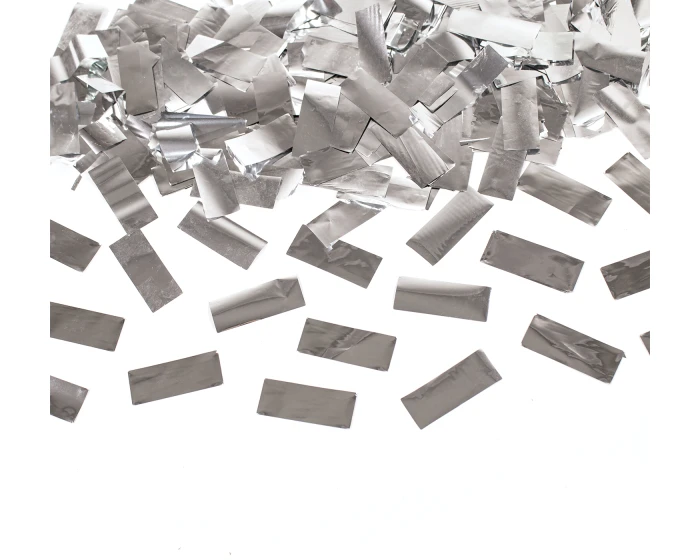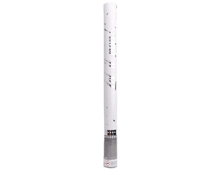 Confetti kanon met zilveren, rechthoekige folieconfetti. Ideaal voor bruiloften, verjaardagsfeestjes, jubilea of ​​oudejaarsavond. Draai gewoon aan de onderkant en wacht tot het kanon knalt! Kanon is 60 cm lang. Alleen voor buiten gebruik.Â