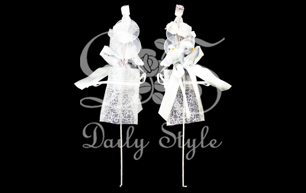 Glitter corsagebedankje met 2 tortelduifjes en een organzazakje op een steker. Het organzazakje biedt ruimte voor een klein kadootje. Het corsagebedankje is in zijn geheel circa 30cm lang en 8,5cm breed. Het organzazakje is ongeveer 6,5×9,5cm groot. Deze corsagebedankjes zijn per 6 stuks verpakt.