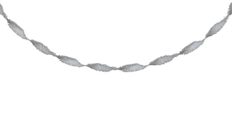 Crepe guirlande slinger in het zilver. De slinger is 24 meter lang en is gemaakt van een brandvertragende crepe, dus ook geschikt voor in de horeca.Â