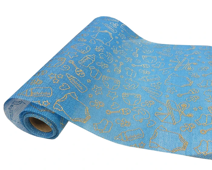 Prachtige decoratiestof/tafelloper van non-woven met baby gerelateerde figuren in glitter gouden bedrukking. De loper is 28 cm breed en zit op een rol van 2,7 meter lang.Â
