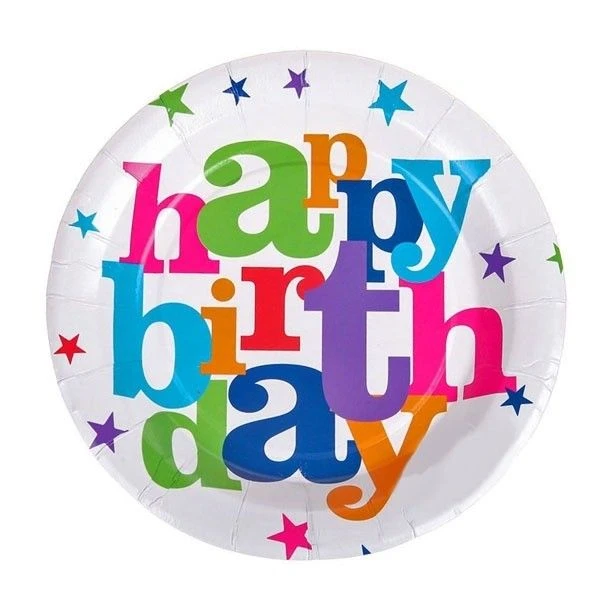 Kleurrijke kartonnen dessert borden met de tekst ‘Happy Birthday’ omringd door sterretjes.