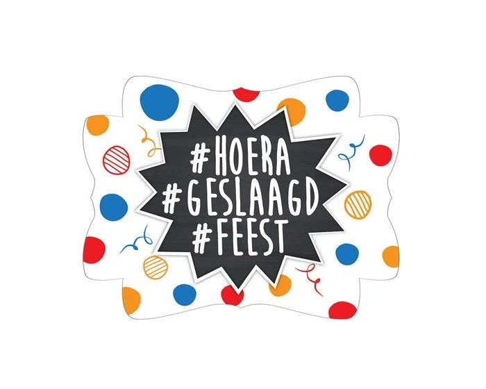 Een deurbord voor aan de wand of aan de deur met de tekst: #Hoera #Geslaagd #FeestÂ