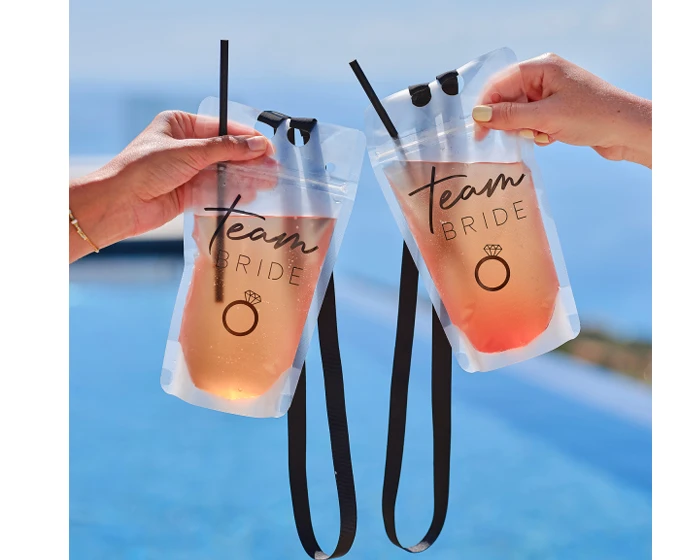 Proost op de aanstaande bruid! Maak het vrijgezellenfeest extra speciaal met deze leuke Team Bride drinkzakjes. Leuk te combineren met The Bride drinkzakje. Elke verpakking bevat 6x drinkzakjes van 23 cm (H) x 15 cm (B), inclusief rietje en koord.