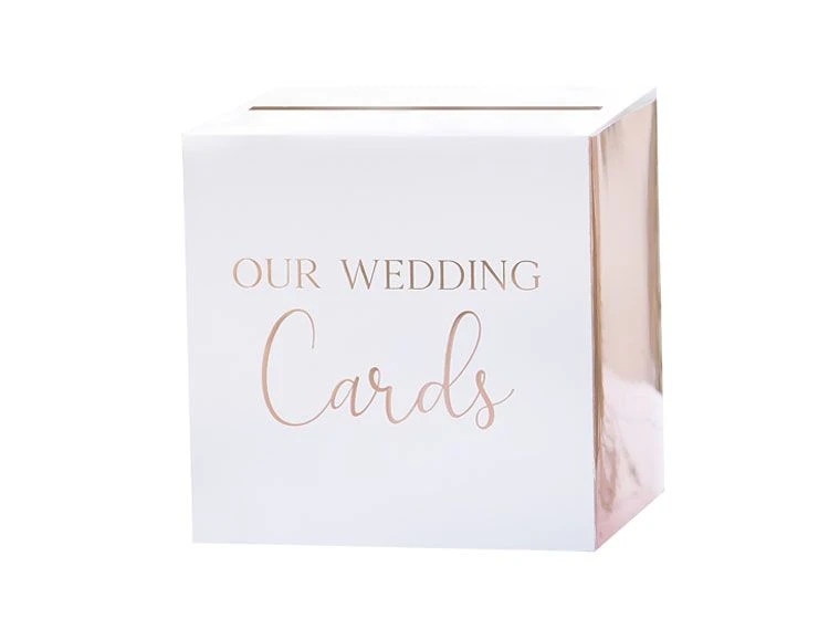 Prachtige witte enveloppendoos met de tekst ‘our wedding Cards’ in het roségoud van Ginger Ray. In deze enveloppendoos kunnen de gasten hun envelop stoppen. De kartonnen doos wordt plat geleverd en is gemakkelijk in elkaar te zetten.