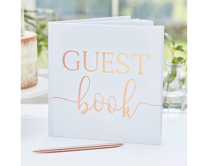 Laat je gasten een bericht schrijven in dit stijlvolle witte gastenboek met roségouden letters Guest Book van Ginger Ray. Het boek bevat 32 blanco pagina’s.