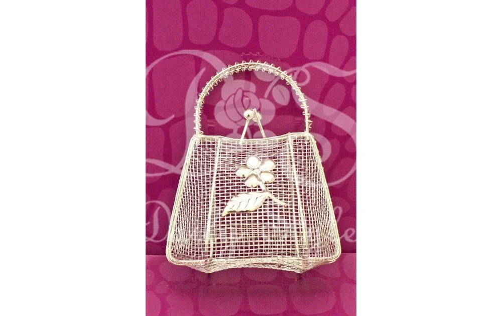 Handtasje van metaaldraad in het zilver. Het tasje is 7,5x9x5cm groot en verkrijgbaar in zilver en goud. LET OP! Producten van metaaldraad zijn zeer buigzaam. Hierdoor kan tijdens de productie en vervoer een deel zijn verbogen. Door de buigzaamheid kan het verbogen deel makkelijk teruggebogen worden. Wij vragen u hiermee rekening te houden.