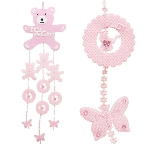 Roze hangdecoratie met de tekst ‘It’s A Girl’. De hangdecoratie bestaat uit één beer van vilt (23x23x0,3cm), waaraan 3 slierten met stoffen figuurtjes zijn bevestigd. De afmetingen van deze figuurtjes zijn: beertje 9,5×9,5cm; krans dia 7,5cm en vlinder 4×5,5cm. De hangdecoratie heeft een totale lengte van 81cm.