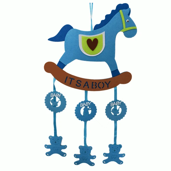 De blauwe hangdecoratie van vilt bestaat uit een hobbelpaard met de tekst ‘It’s A Boy’ en eronder hangen beertjes en rondjes met de tekst ‘Baby’.