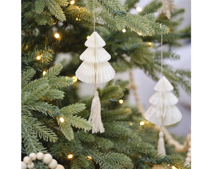 Maak je kerstboom af met deze prachtige hangdecoratie honeycomb kerstbomen crème van Ginger Ray. Een verpakking bevat 4 hangers.
