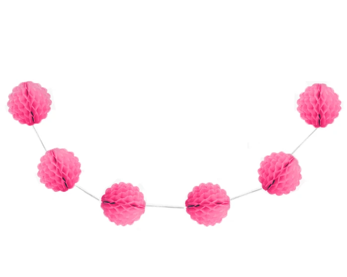 3 meter lange stringdecoratie met 8 honeycomb bollen, verkrijgbaar in diverse kleuren. De tissue honeycomb bollen hebben een diameter van 10 cm.