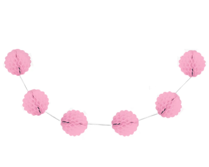 3 meter lange stringdecoratie met 8 honeycomb bollen, verkrijgbaar in diverse kleuren. De tissue honeycomb bollen hebben een diameter van 10 cm.