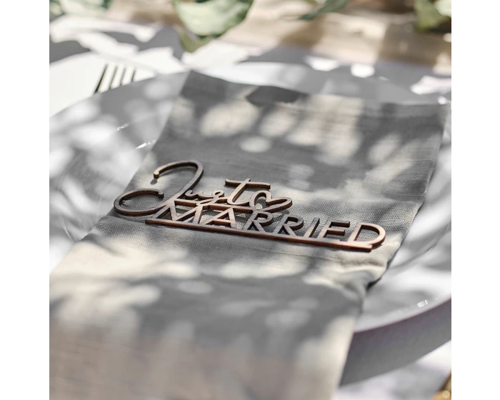 Leg deze houten Just Married teksten op de borden voor een stijlvolle tafelaankleding tijdens het diner. De set bestaat uit 6 stuks.