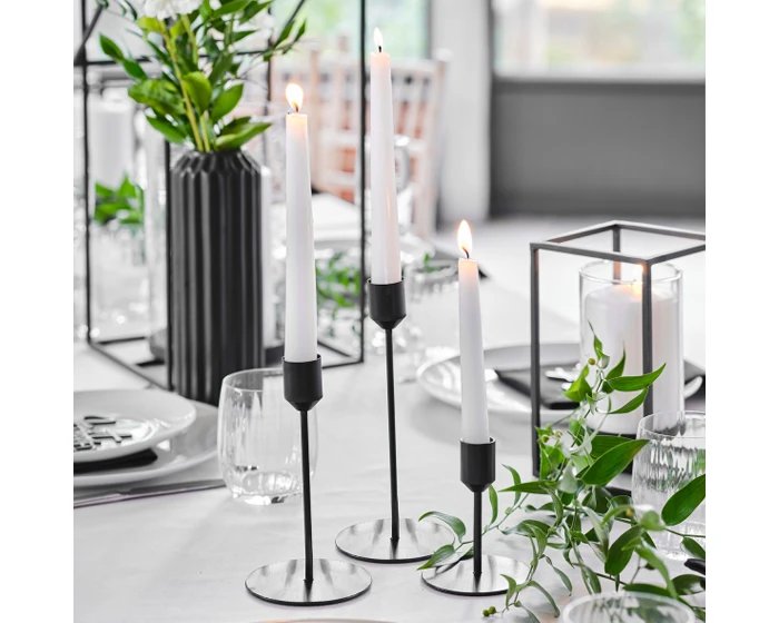 Elke verpakking bevat 3 zwarte kandelaars in de maten 20cm, 15cm en 10cm.