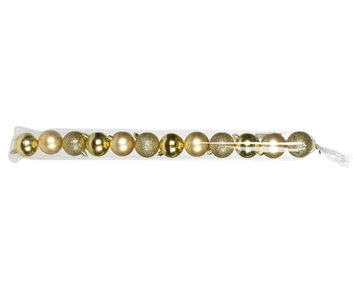 Set van 12 kerstballen in het goud, met elk een diameter van 5 cm. De set bevat matte, glazende en glitter kerstballen.Â