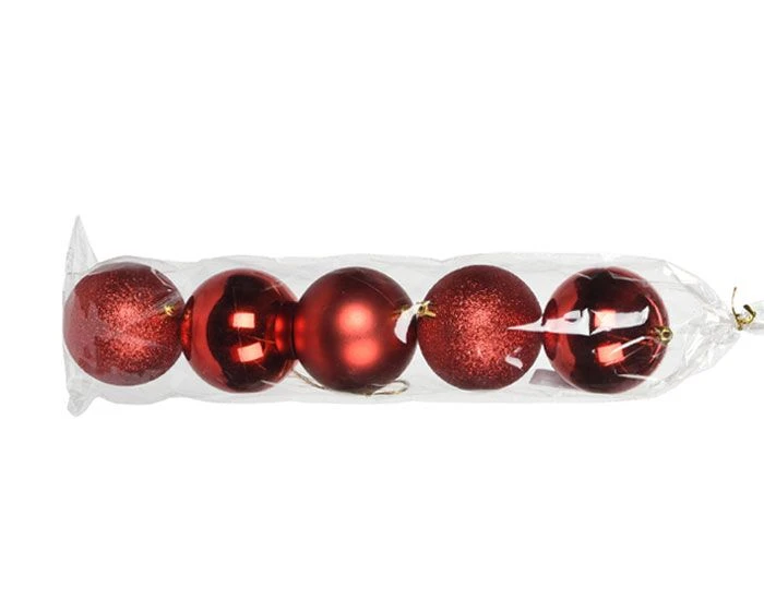 Set van 5 kerstballen in het rood, met elk een diameter van 8 cm. De set bevat 1 matte, 2 glazende en 2 glitter kerstballen.Â