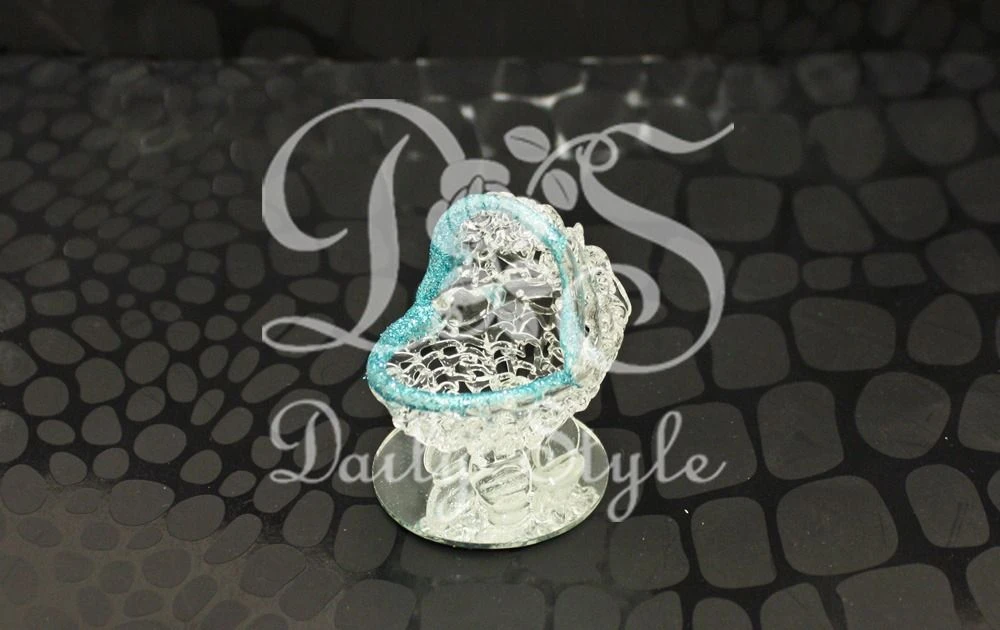 Kristallen wiegje op een spiegeltje. Het kristallen wieg beeldje is 4,5×3,5x5cm (LxBxH) en het spiegeltje heeft een dia van 4cm. Het beeldje wordt geleverd in een transparant doosje met een gouden of zilveren strikje. Â