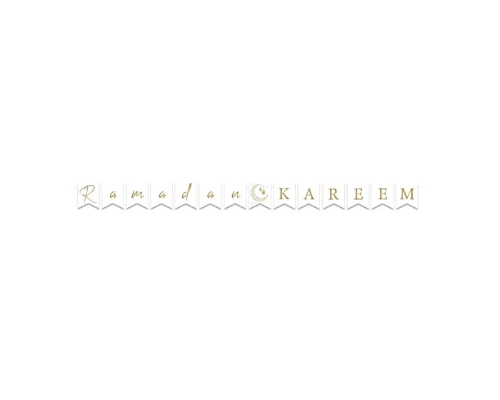 Prachtige papieren letterbanner die samen de tekst ‘Ramadan Kareem’ vormen. De letters zijn bedrukt in goudfolie. Elk vlaggetje heeft een afmeting van 12 (l) x 15 (h) cm.Â