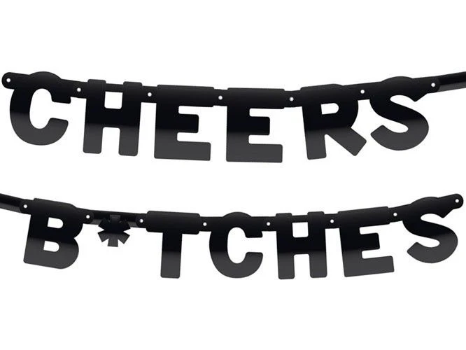 Zwarte slinger met de woorden ‘cheers b*tches’. De kartonnen slinger ‘CHEERS B*TCHES’ is ca 130cm lang.
