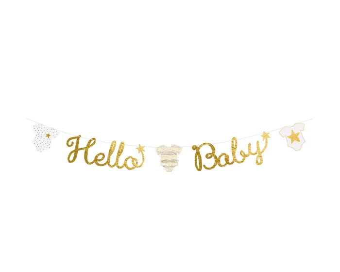 Prachtige letterslinger die de tekst ‘Hello Baby’ vormt in goude letters en drie afbeeldingen van een rompertje. De slinger is ongeveer 160cm lang.Â
