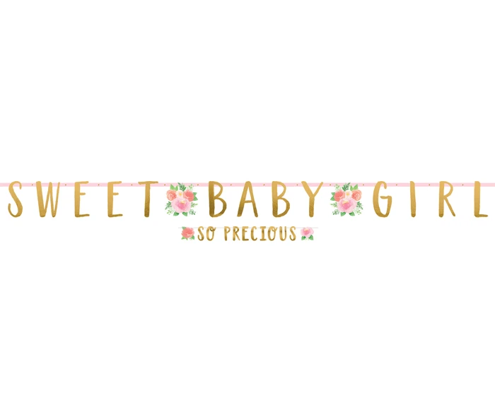 Kartonnen jumbo letterslinger met de teksten ‘sweet baby girl’ en ‘so precious’ en afbeeldingen van pastelkleurige bloemen.Â
