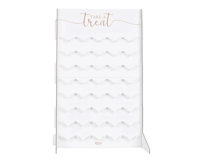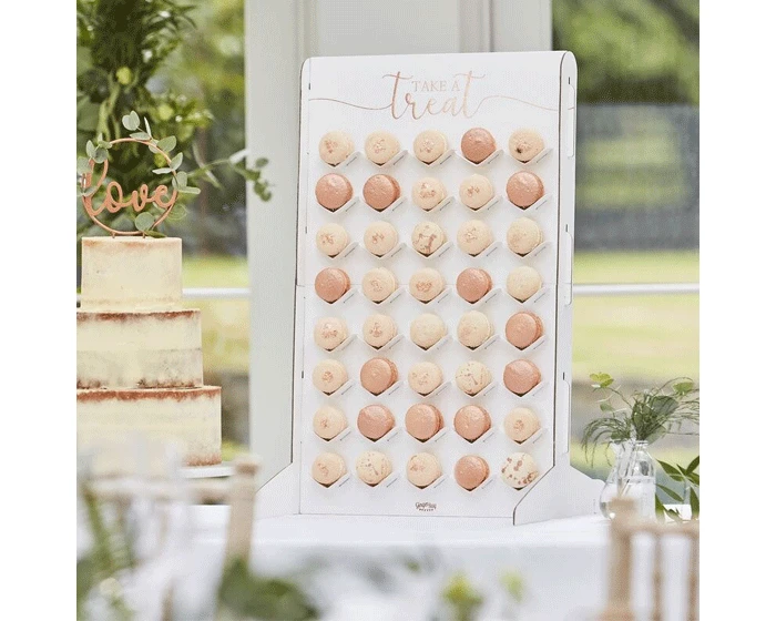 Presenteer je macarons aan deze prachtige macaron wall. De macaron wall is gemaakt van karton en heeft bovenaan de tekst Take a Treat in mooie roségouden sierletters. Op de wall is ruimte voor 40 macarons.