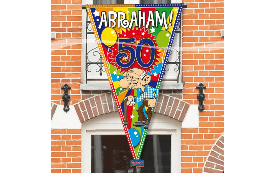 Mega balkon- of deurpuntvlag voor de jarige Abraham. De vlag is 90x150cm groot.