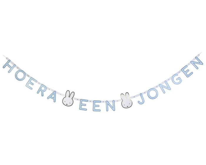 Vrolijke figurenslinger met Nijntje figuren en de tekst ‘Hoera een Jongen’. Leuk als versiering bij een geboorte, babyshower of kraamfeest.