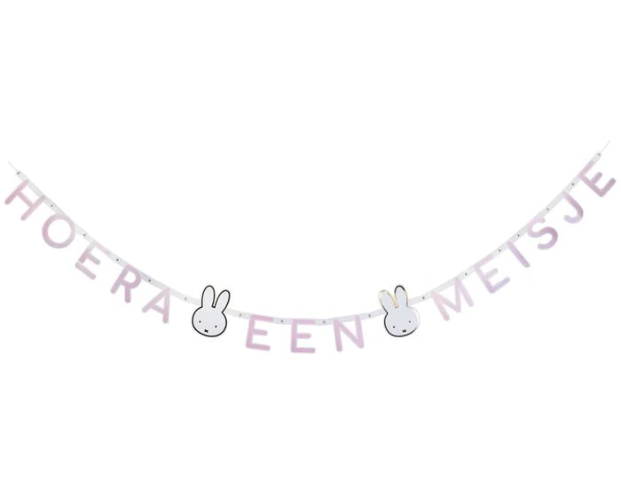 Vrolijke figurenslinger met Nijntje figuren en de tekst ‘Hoera een Jongen’. Leuk als versiering bij een geboorte, babyshower of kraamfeest.Â