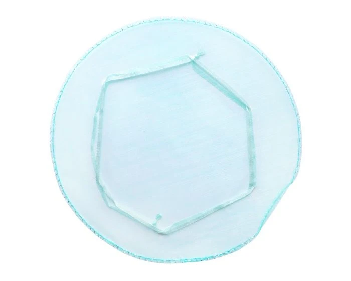 Ronde organzazak in het lichtblauw. Deze ronde organzazak met lint heeft een diameter van 24 cm. Door aan het lint te trekken wordt het platte stuk stof een mooi bol zakje. Per 12 verpakt.