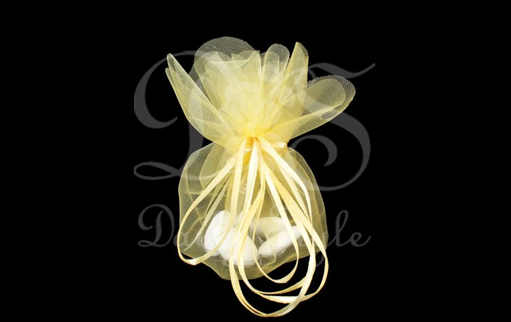 Ronde organzazak in de kleur goud. Deze ronde organzazak met lint heeft een diameter van 35 cm. Door aan het lint te trekken wordt het platte stuk stof een mooi bol zakje. Per 12 verpakt.