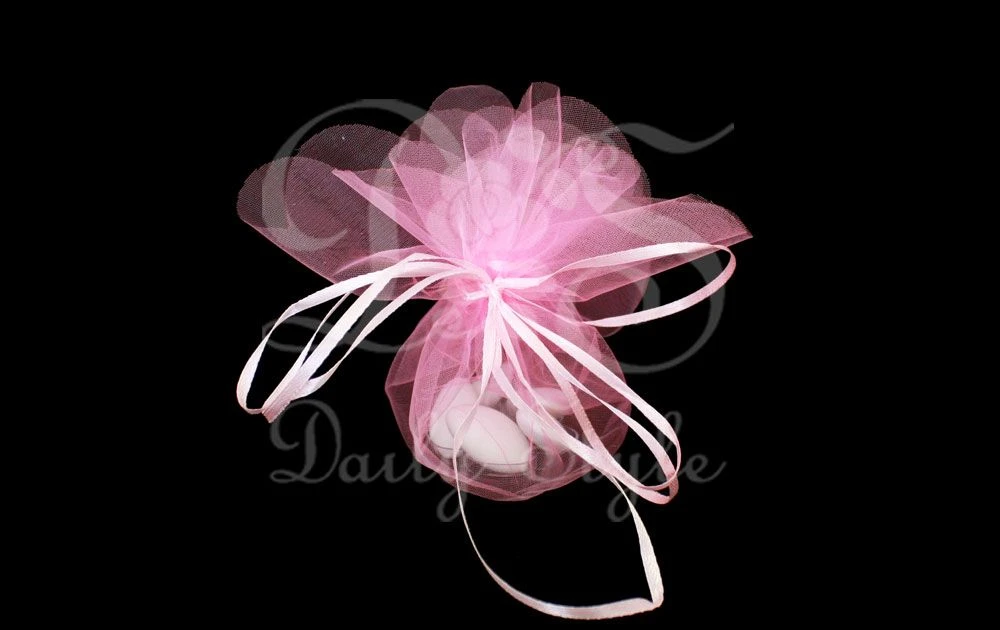 Ronde organzazak in de kleur roze. Deze ronde organzazak met lint heeft een diameter van 24 cm. Door aan het lint te trekken wordt het platte stuk stof een mooi bol zakje. Per 12 verpakt.