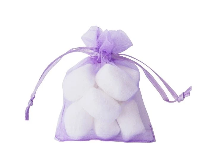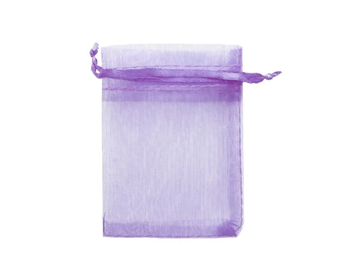 Kleine organzazak in de kleur paars. Het zakje heeft een afmeting van 7 x 9 cm. Eén verpakking bevat 12 organzazakjes.