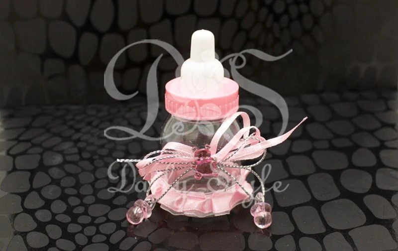 Plastic papflesje met een lintje en een embleem met beertje en speentjes. Het flesje heeft een diameter van 4cm en is 9cm hoog. De opening heeft een dia van 3cm. In het papflesje past maximaal: 11 chocoladedragees of 21 vruchtenhartjes of 41 lentilles