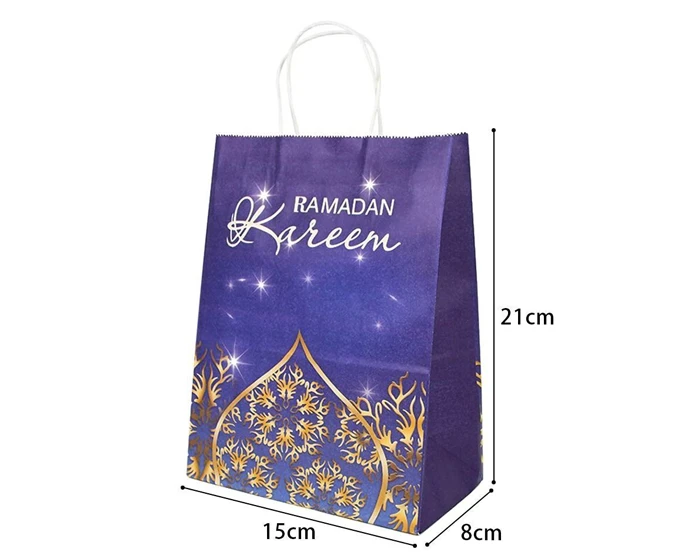 Papieren Ramadan Kareem cadeautasjes om al je geschenkjes in te doen tijdens het Suikerfeest. Een tasje heeft een afmeting van 21x15x8cm (excl. handvat) en is verpakt per 6 stuks.Â