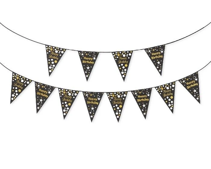 Zwarte ‘Happy Birthday’ vlaggenlijn van papier met metallic gouden en witte cirkels & sterretjes. De slinger dient nog zelf in elkaar geregen te worden met het bijgeleverde lint (ca. 5m).Â