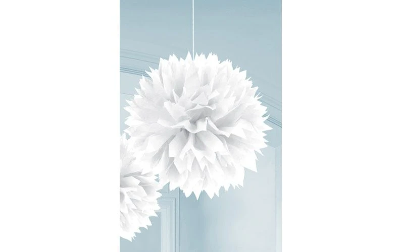 Papieren decoratie pompom in het wit. De pompom heeft een diameter van 30 cm en bestaat uit 10 vellen tissuepapier met ronde hoeken. Makkelijk om uit te vouwen.Â