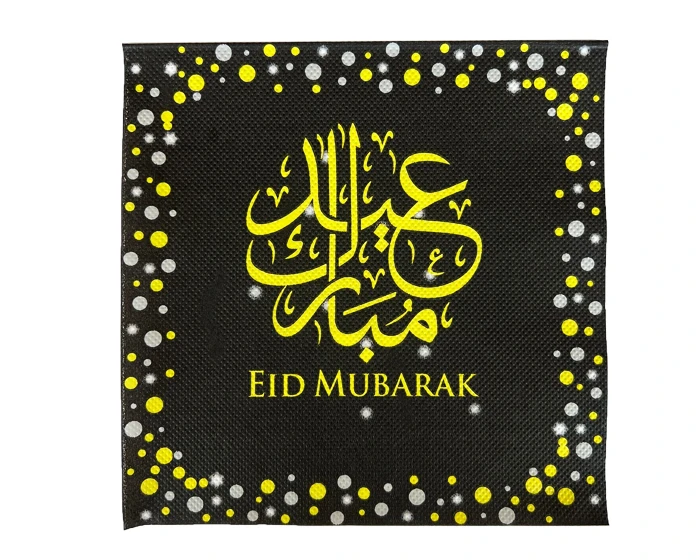 Stijlvolle servetten met de tekst Eid Mubarak. De servetten hebben een afmeting van 33x33cm (uitgevouwen) en zijn verpakt per 20 stuks.Â