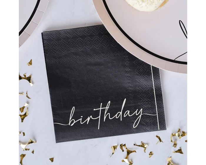 Vier je verjaardag in stijl met deze luxe Happy Birthday servetten van Ginger Ray in zwart en nude kleuren. Elke verpakking bevat 16 servetten met een afmeting van 12,5×12,5cm.Â