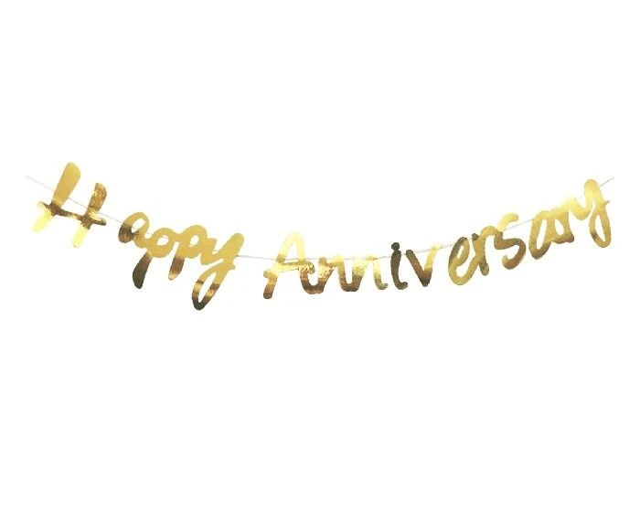 Papieren slinger met de tekst ‘Happy Anniversary’ in het goud. Leuk om op te hangen tijdens een jubileumfeest.Â